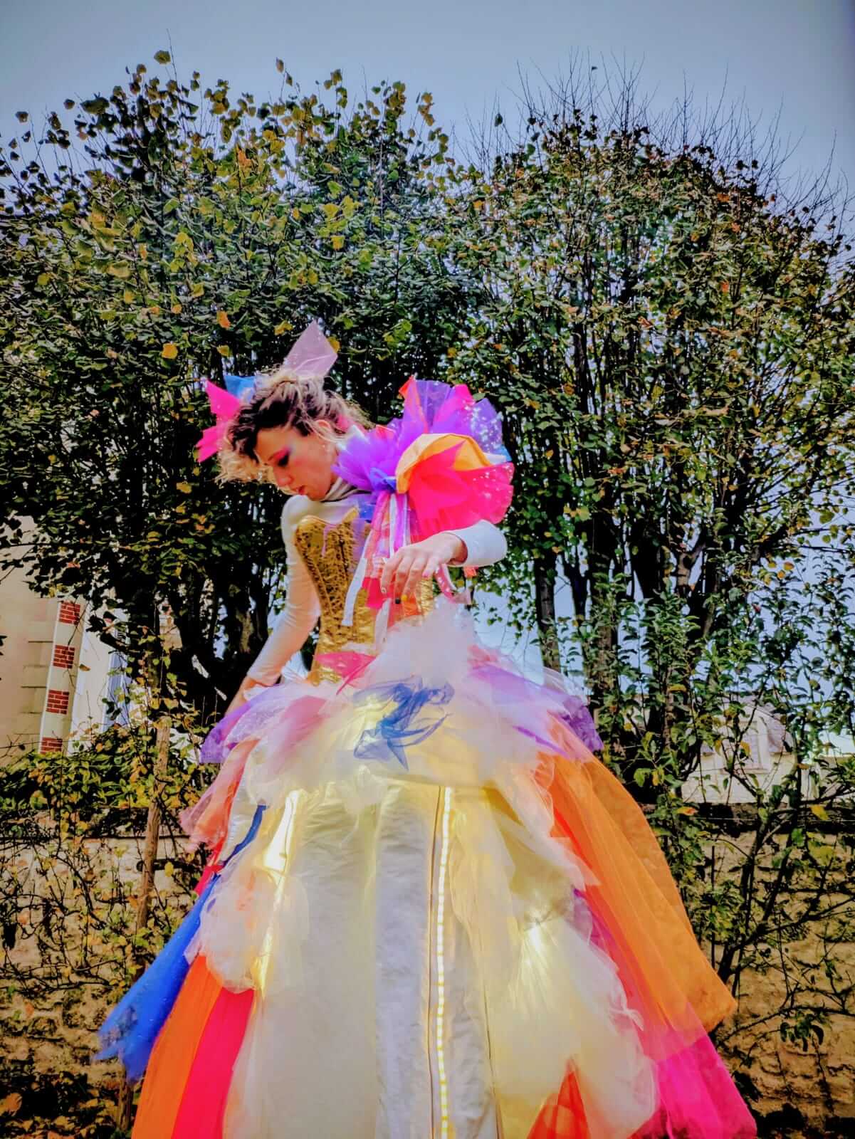 Une échassière haute en couleur, lumineuse et rayonnante, parcourt les rues avec grâce et poésie. Perchée sur ses grandes jambes scintillantes, elle illumine la nuit aux fils de ses pas. Chaque rencontre devient un instant suspendu, une étincelle qui attire les regards Son costume éclatant et présence douce et malicieuse invite petits et grands à rêver et à sourire.